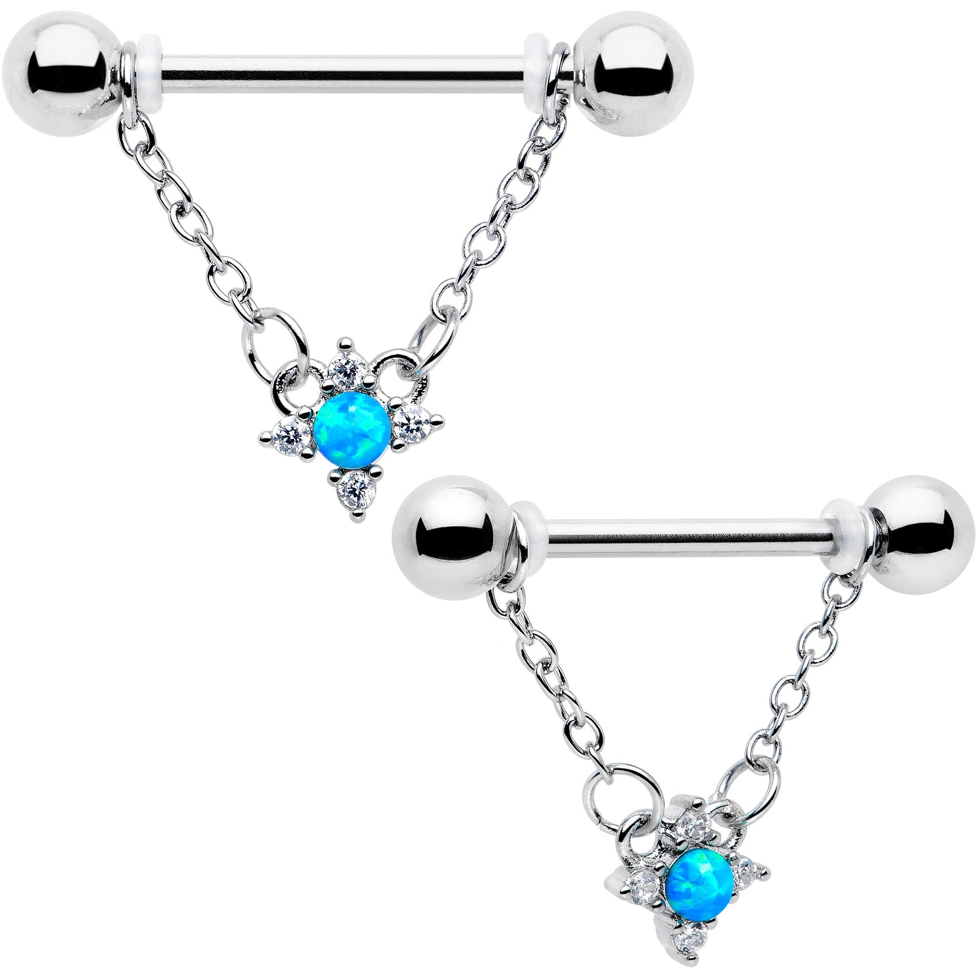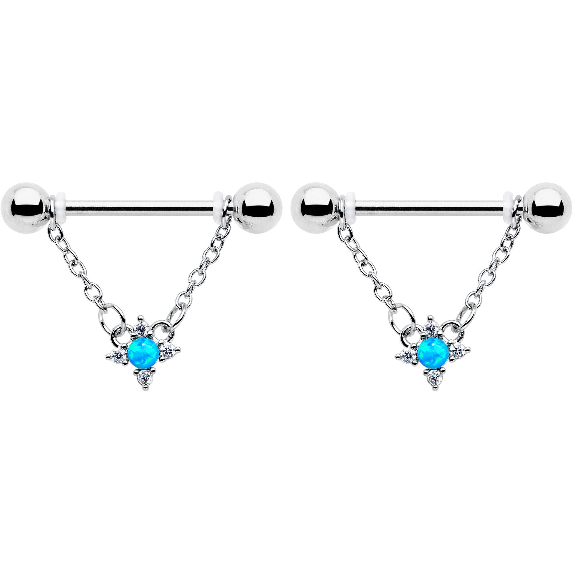 You'll feel like a star when you're rocking this 14 gauge nipple jewelry. It's made with 14mm durable 316L surgical grade stainless steel straight barbells with 5mm ball ends and each one supports a double length of matching chains. Each pair of chains supports an elegant star charm, with clear cubic zirconia gems set in each of the points. The stars are each set with a blue synthetic opal at the center for a color contrast you can't take your eyes off of. Look as regal as you feel with these elegant celestial nipple piercing rings. Sold as a set of two.