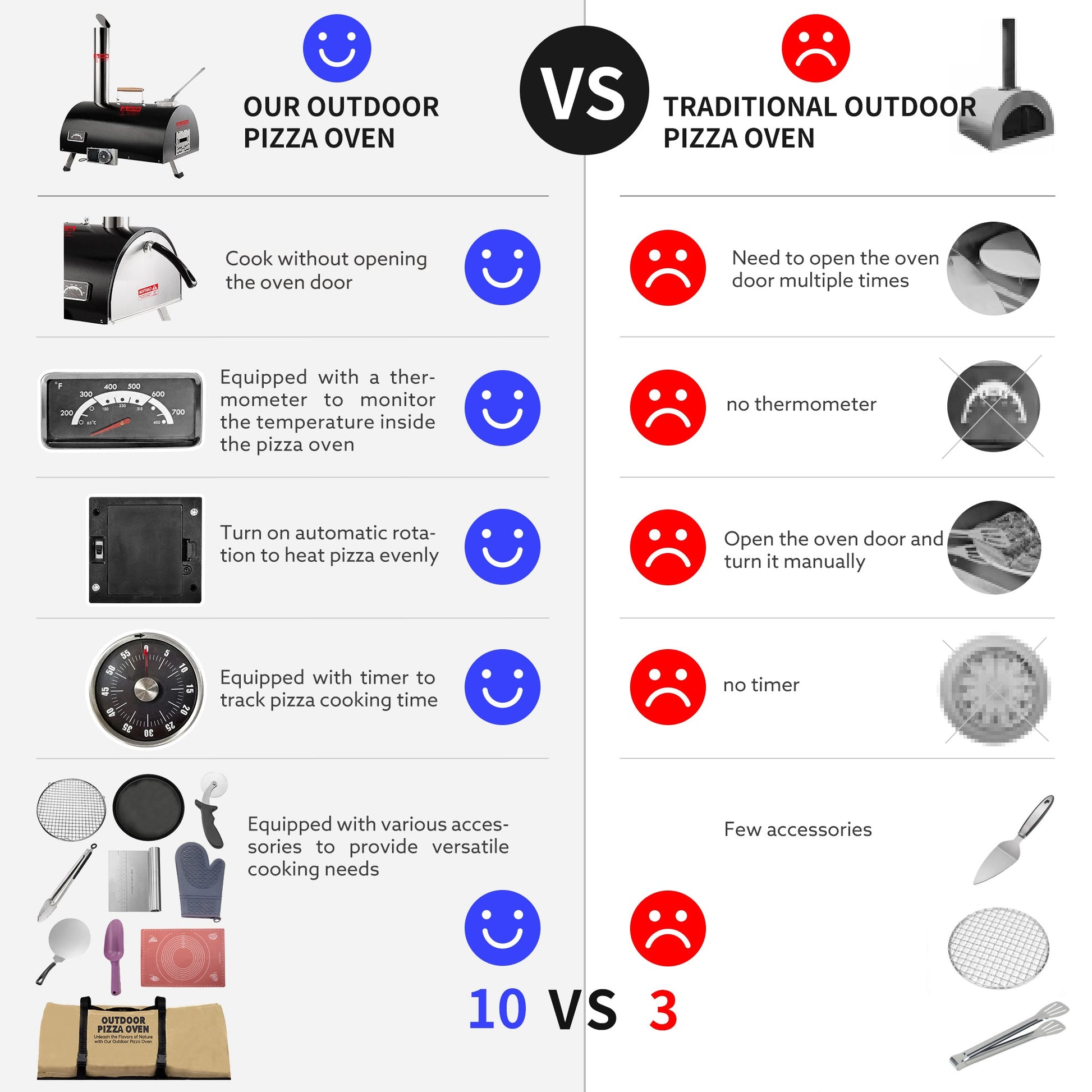 Automatic rotating turntable for even heating: The outdoor pizza oven features an automatic rotating turntable that ensures even heating, resulting in a perfectly cooked pizza with evenly baked crust and toppings.
