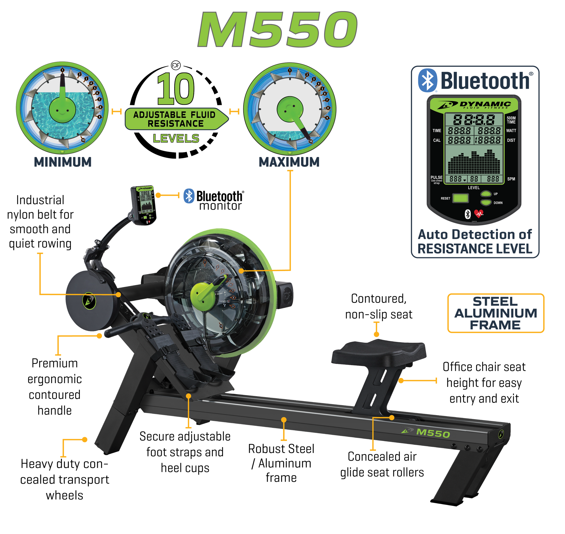 This Fluid Rower M550 offers unrivaled natural catch and resistance, featuring Dynamic’s (FDF) patented Variable Fluid innovation for instant adjustable resistance at the turn of a lever. Our twin tank water resistance rowing system delivers a massive range of resistance to suit every rower, from seniors to professional athletes and personal training.