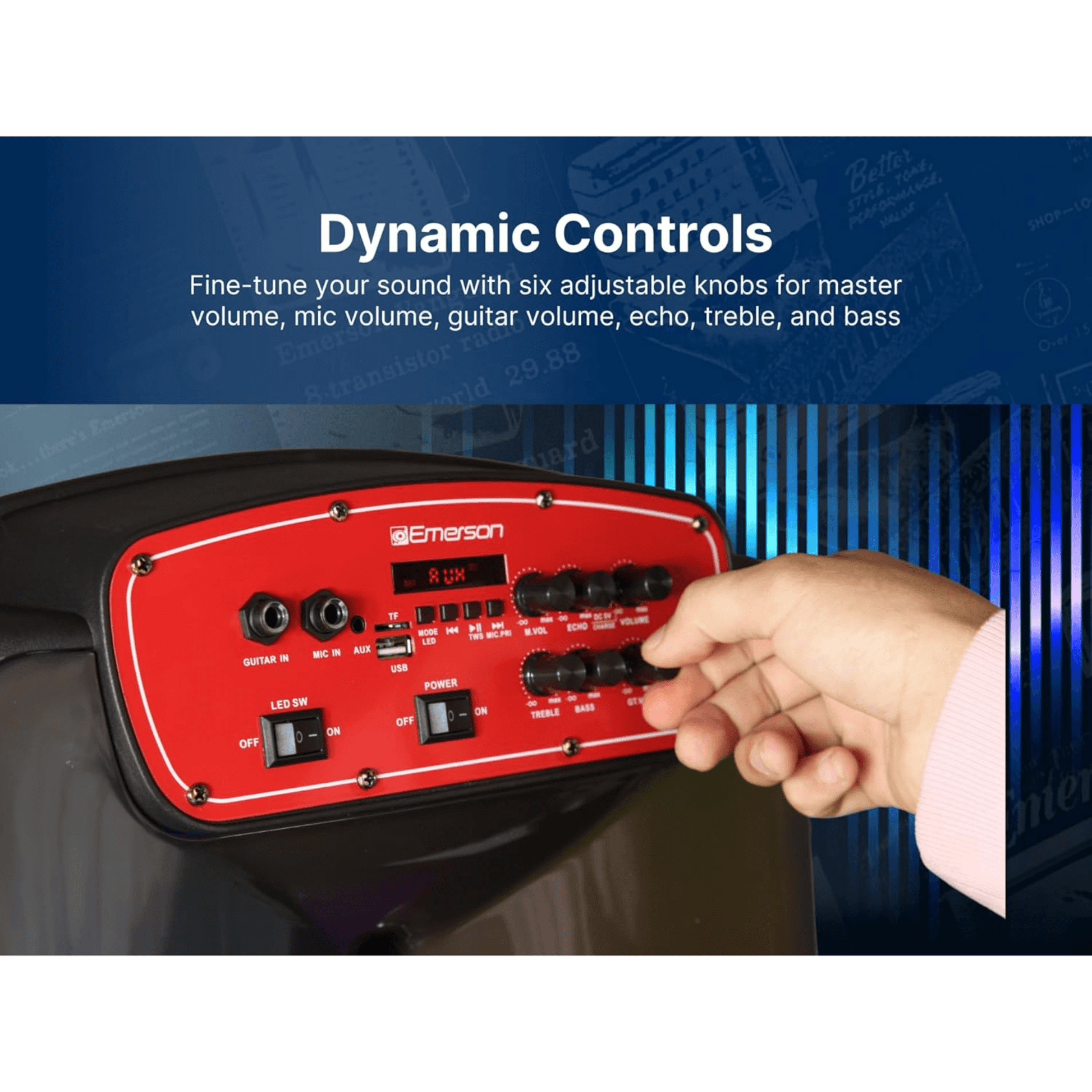 - Controls: Treble, Bass, Mic Volume, Echo, Master Volume, Guitar Volume