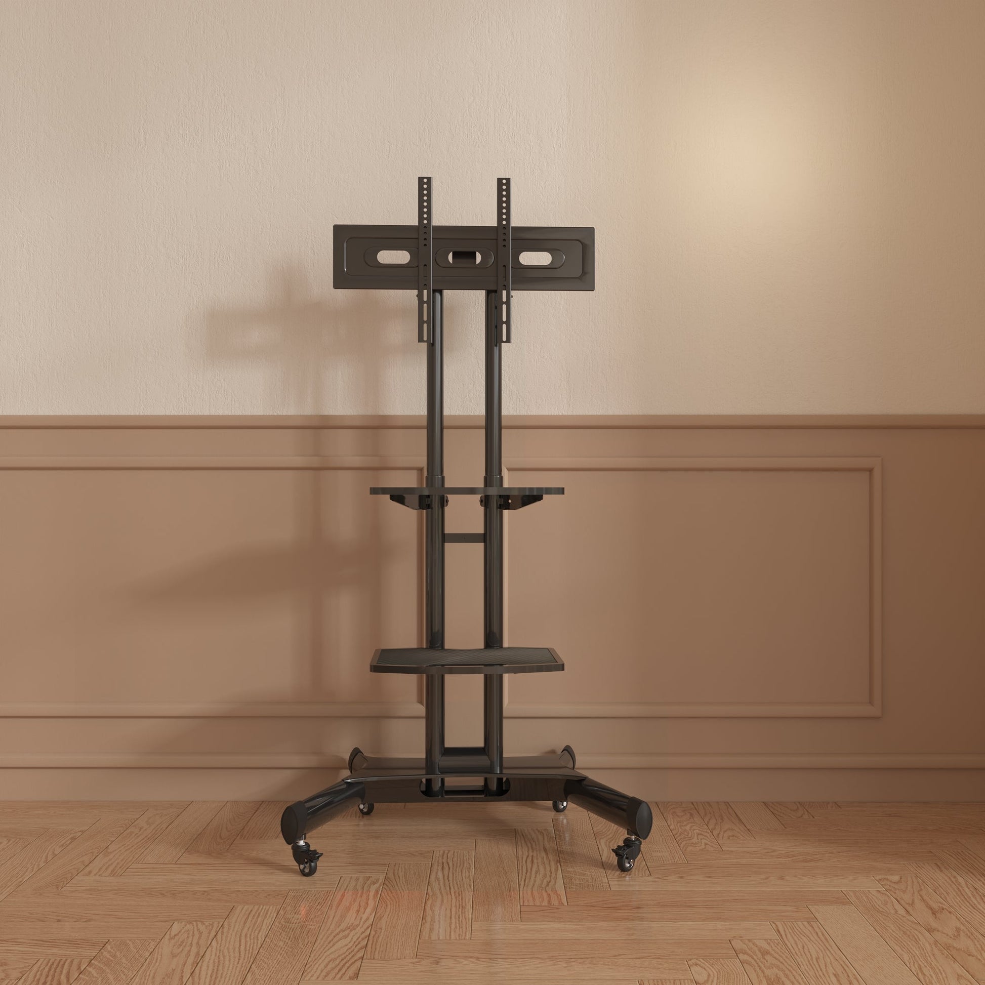 Movable TV stand wheels allow you to easily move the TV from room to room and the rolling TV cart's wheels are easily locked to ensure safety.