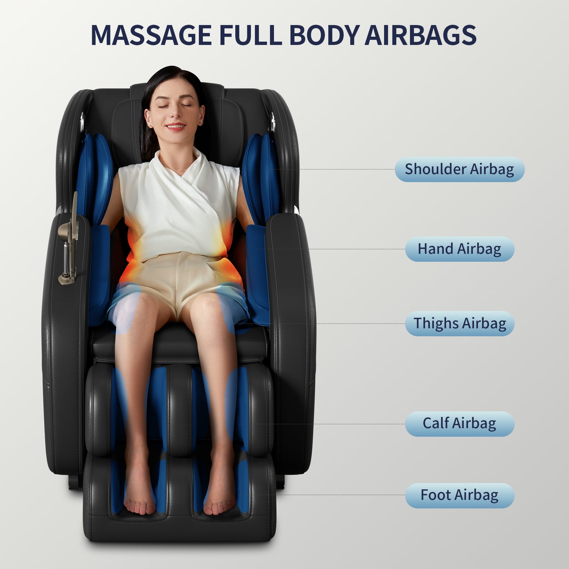 Full-Body Massage Chair: This massage chair features airbags that cover the shoulders, arms, hips, calves, and feet. The airbags squeeze and knead to provide a comprehensive full-body relaxation experience.