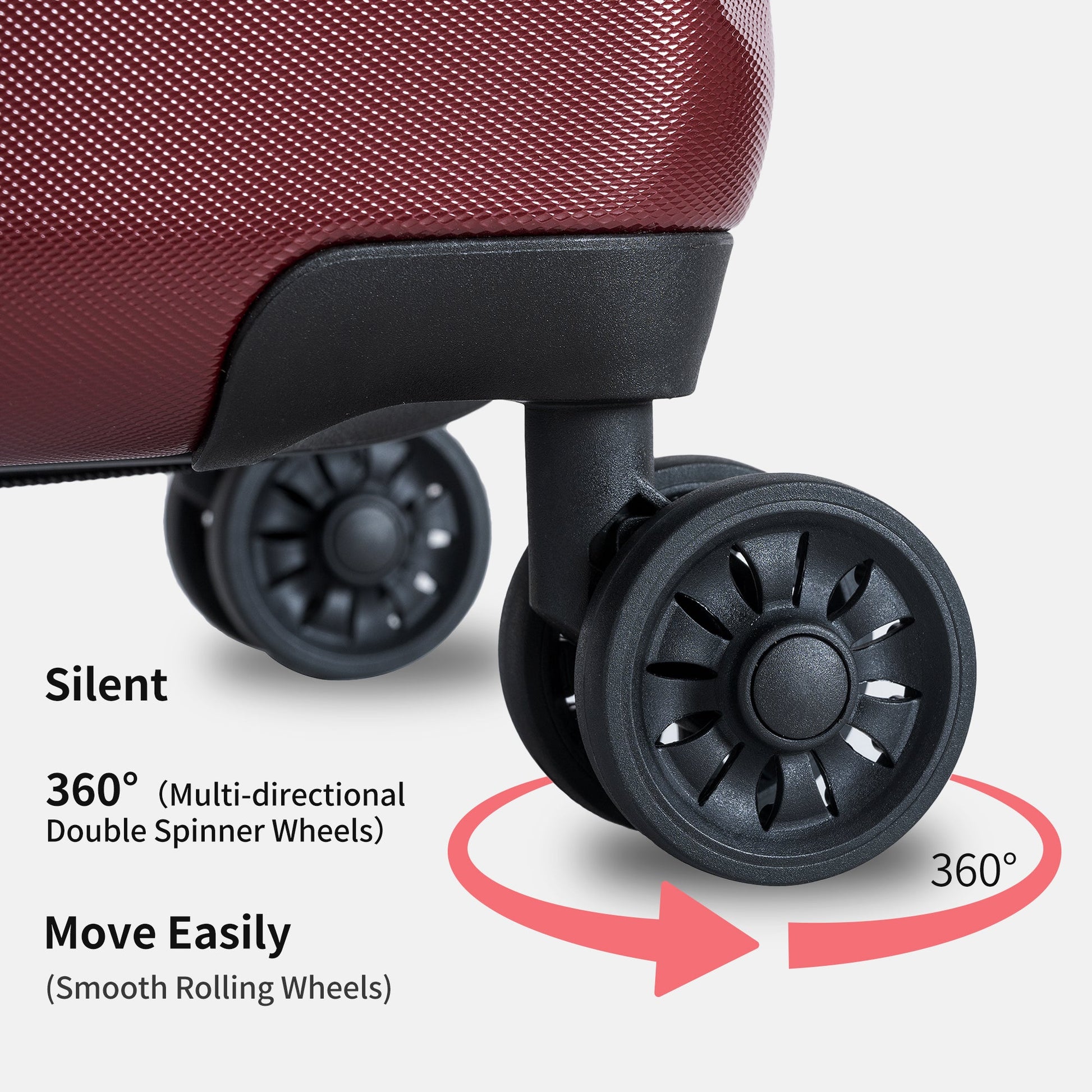 [Effortless 360-Degree Spinner Wheels]:Say goodbye to the hassle of maneuvering heavy luggage. Our luggage set is equipped with smooth and responsive 360-degree spinner wheels, allowing you to effortlessly glide through airports, train stations, and busy streets. Experience unmatched mobility and enjoy the convenience of seamless multidirectional movement.