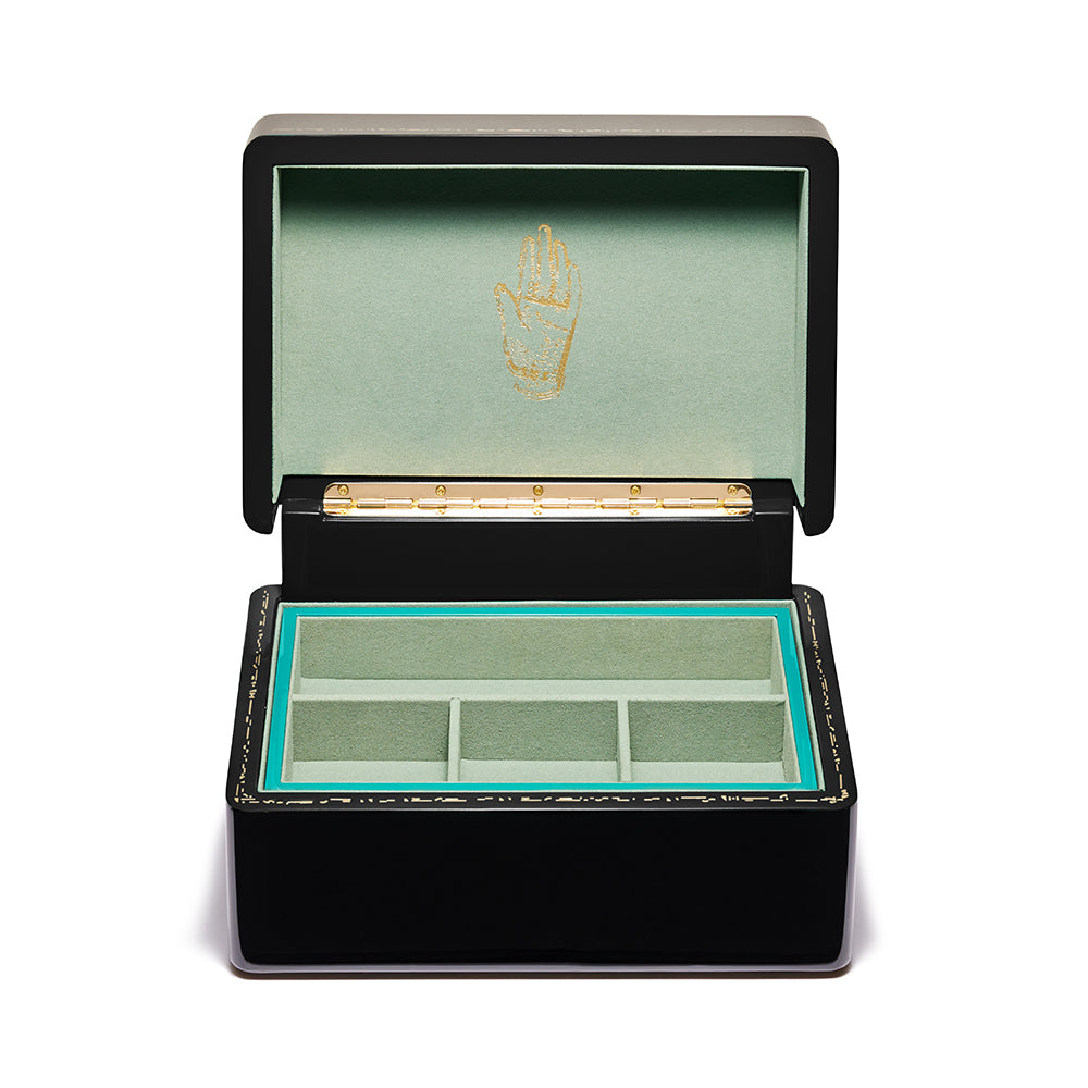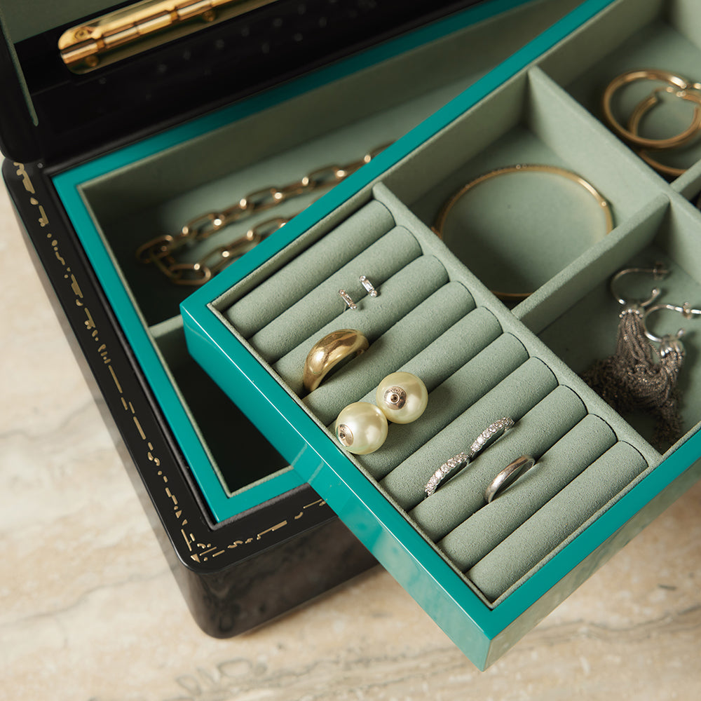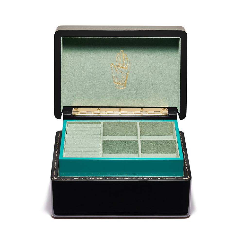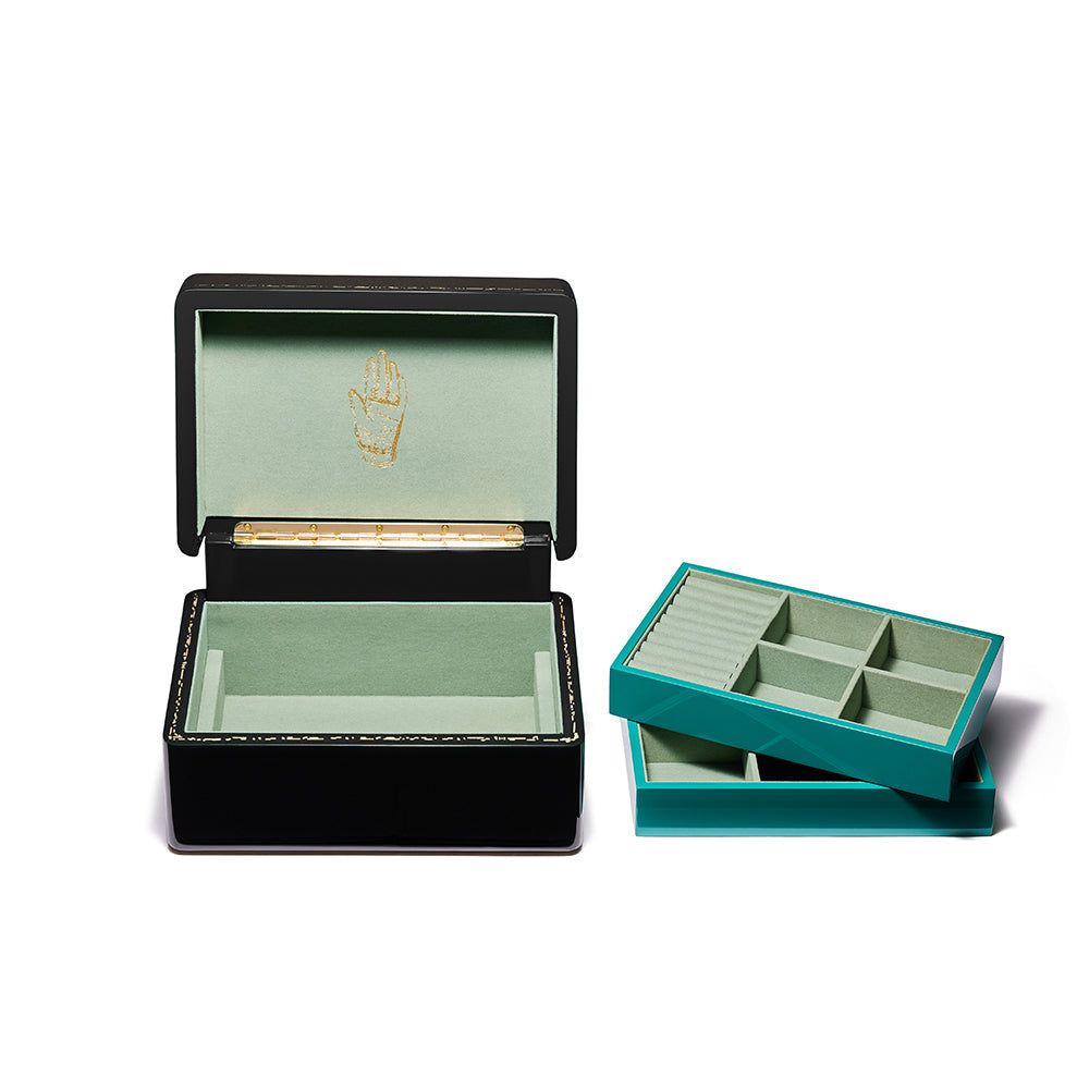 Mini Trunk is classically proportioned, in the size and scale of traditional jewelry boxes. The black high polish lacquer exterior opens to reveal a tonal green interior - a superb backdrop for your jewels to sparkle.