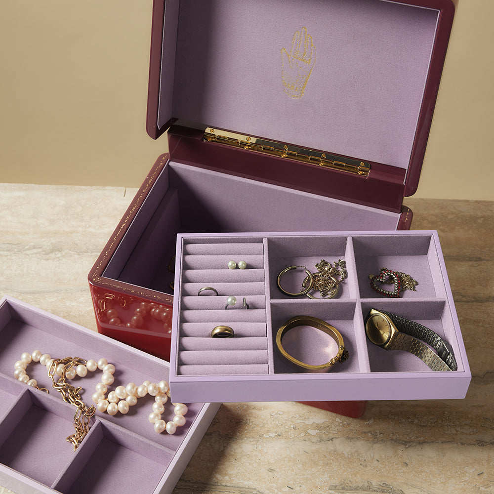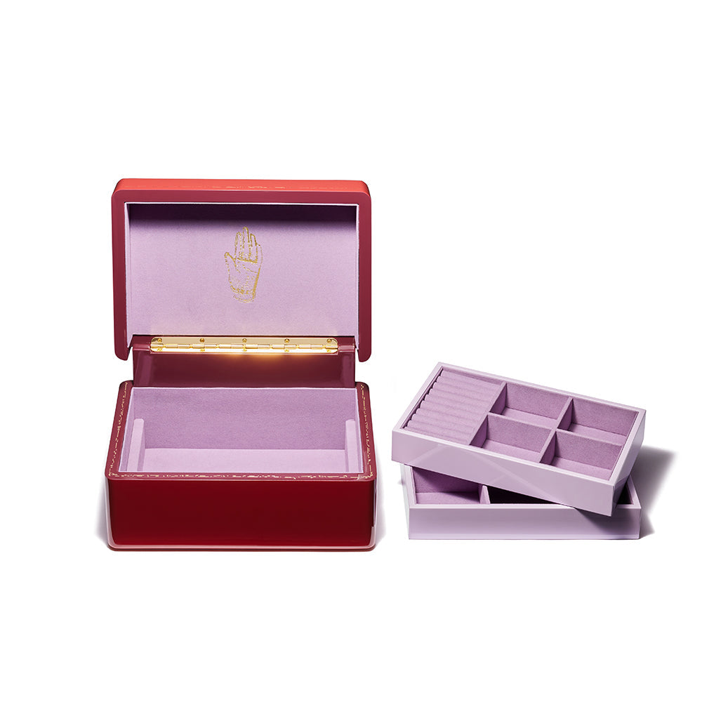 Mini Trunk is classically proportioned, in the size and scale of traditional jewelry boxes. The luxurious red exterior gives it presence and opens to reveal a lilac interior - a superb backdrop for your jewels to sparkle.