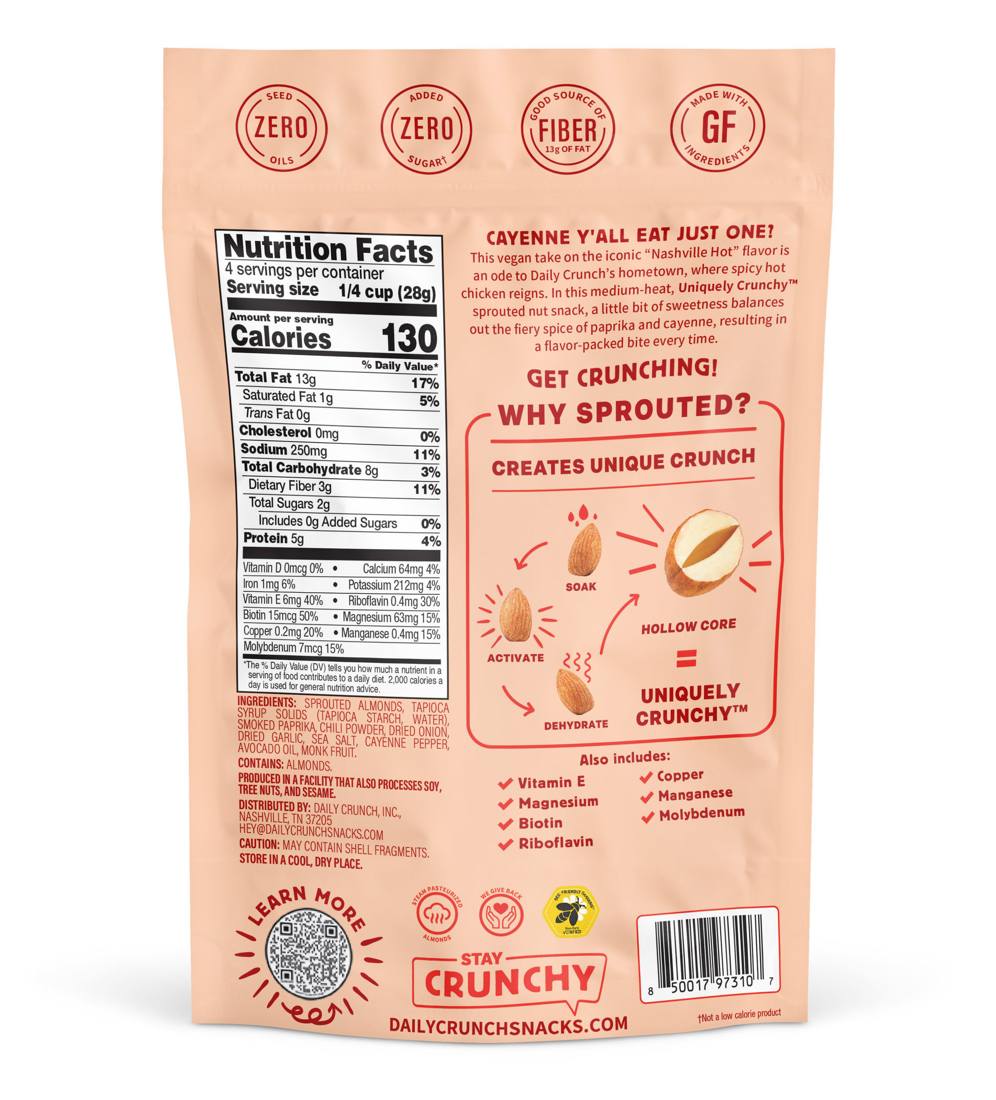 CAYENNE Y'ALL EAT JUST ONE? This vegan take on the iconic “Nashville Hot” flavor is an ode to Daily Crunch’s hometown, where spicy hot chicken reigns. In this medium-heat, Uniquely Crunchy™ sprouted nut snack, a little bit of sweetness balances out the fiery spice of paprika and cayenne, resulting in a flavor-packed bite every time. Get Crunching!