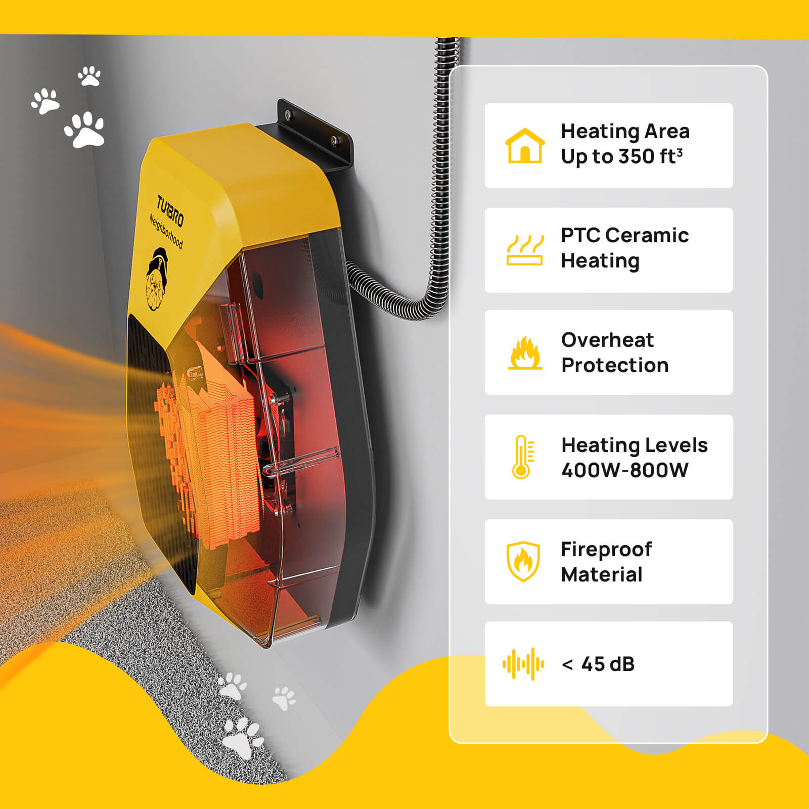 - Fast Heating: A powerful heater with built-in fan circulates hot air to heat up to 350 ft³ of pet housing. Using the low (400W) or high (800W) heating levels, you can switch the heat level depending on how cold it is outside.