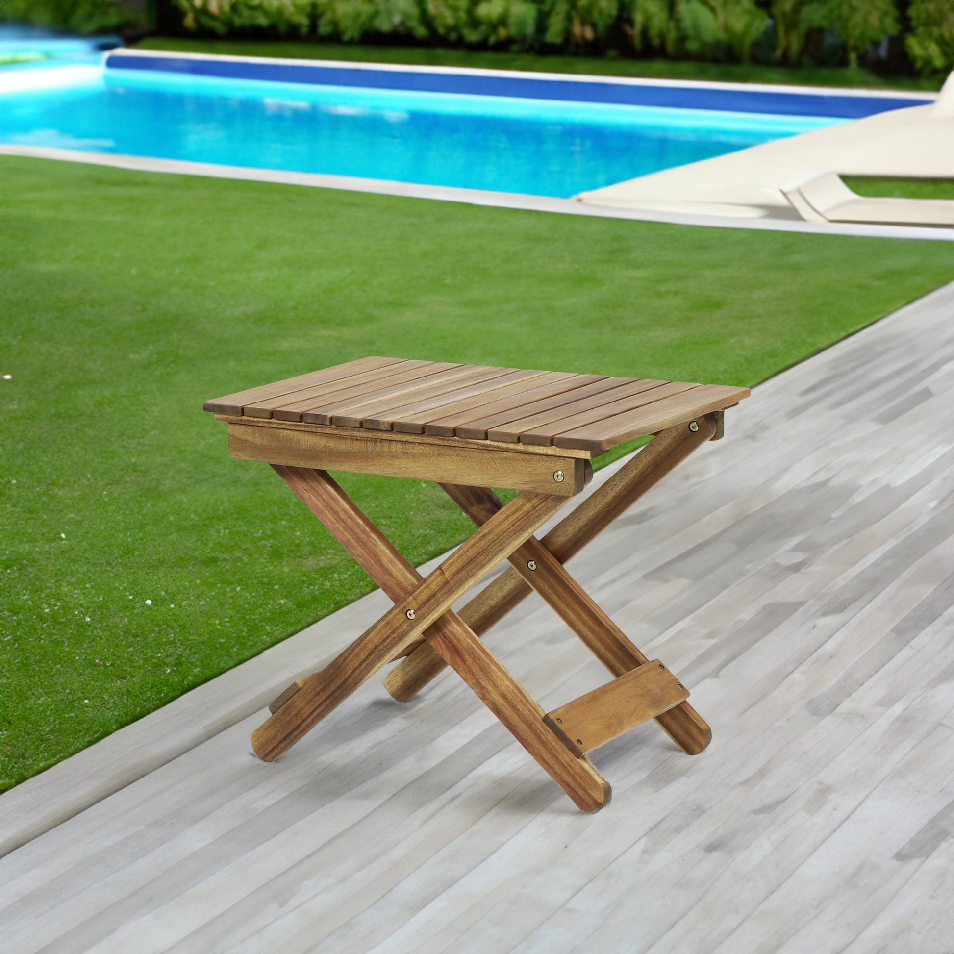 Give your outdoor seating ensemble a perfect companion that you can easily transport or store when not in use. With a classy rustic look, our side table brings a refined touch that is sure to impress guests and family alike. This accessory features stunning slat paneling and a foldable frame to enhance the way you utilize your backyard or patio space. Whether you are placing a chilled drink next to your lounge space or snacking on a plate of refreshments, our side table has you covered. Includes: One (1) Side Table Material: Acacia Wood Finish: Natural Hand-Crafted Details Assembly Required Dimensions: 15.00 inches deep x 22.75 inches wide x 18.25 inches high