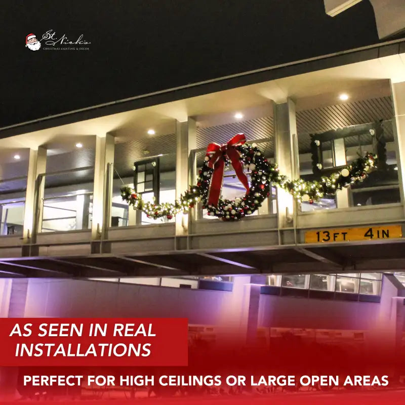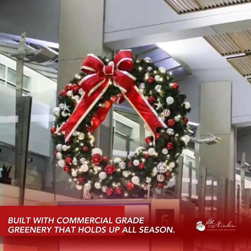 Create a captivating holiday atmosphere with our enchanting Red, White, and Silver Pre-decorated Wreath. This beautifully crafted wreath features a delightful assortment of red, white, and silver ornaments, expertly arranged and enhanced by twinkling warm white lights. Its impressive size and elegant design make it a focal point that radiates festive cheer and sophistication.