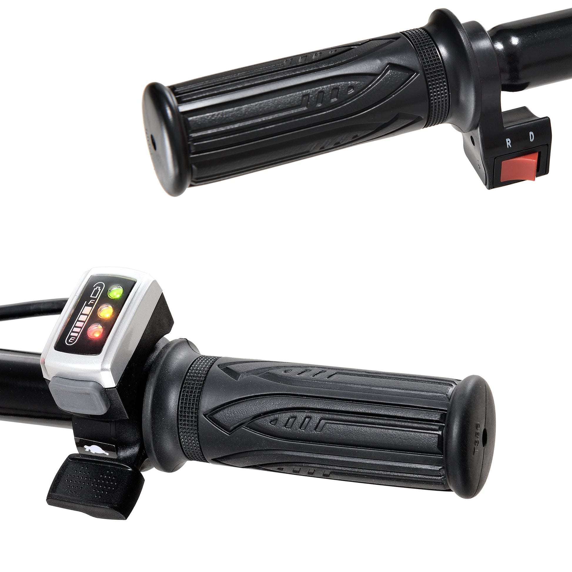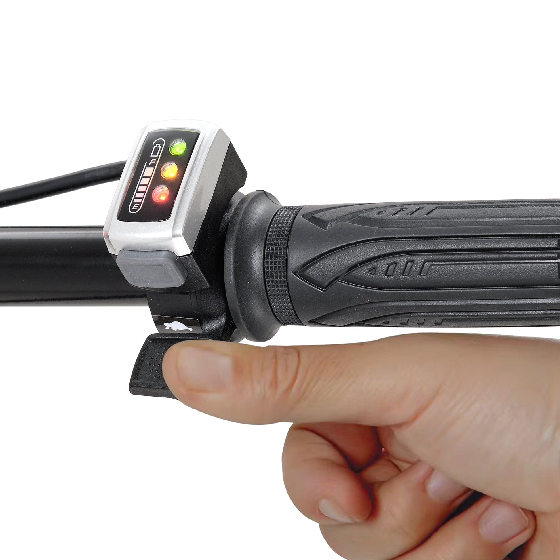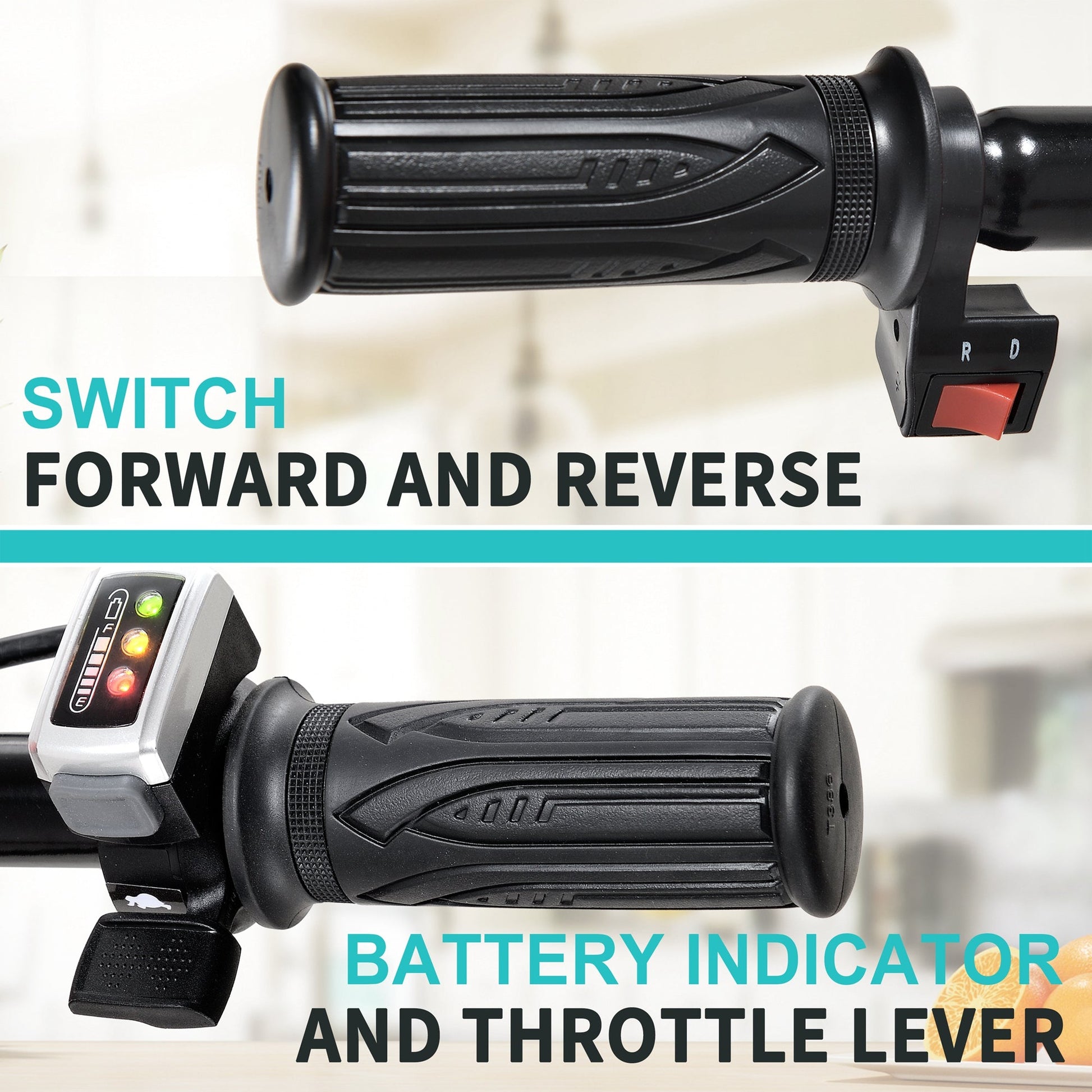 For the all-electric 24V brushless motor system, we use (2) 12V 7Ah AGM rechargeable deep cycle non-spill sealed lead-acid batteries totaling 168Wh (watt-hours) of use from the 24V MAX series connection system. When the battery is charging, the charging light turns green to indicate that it is full.