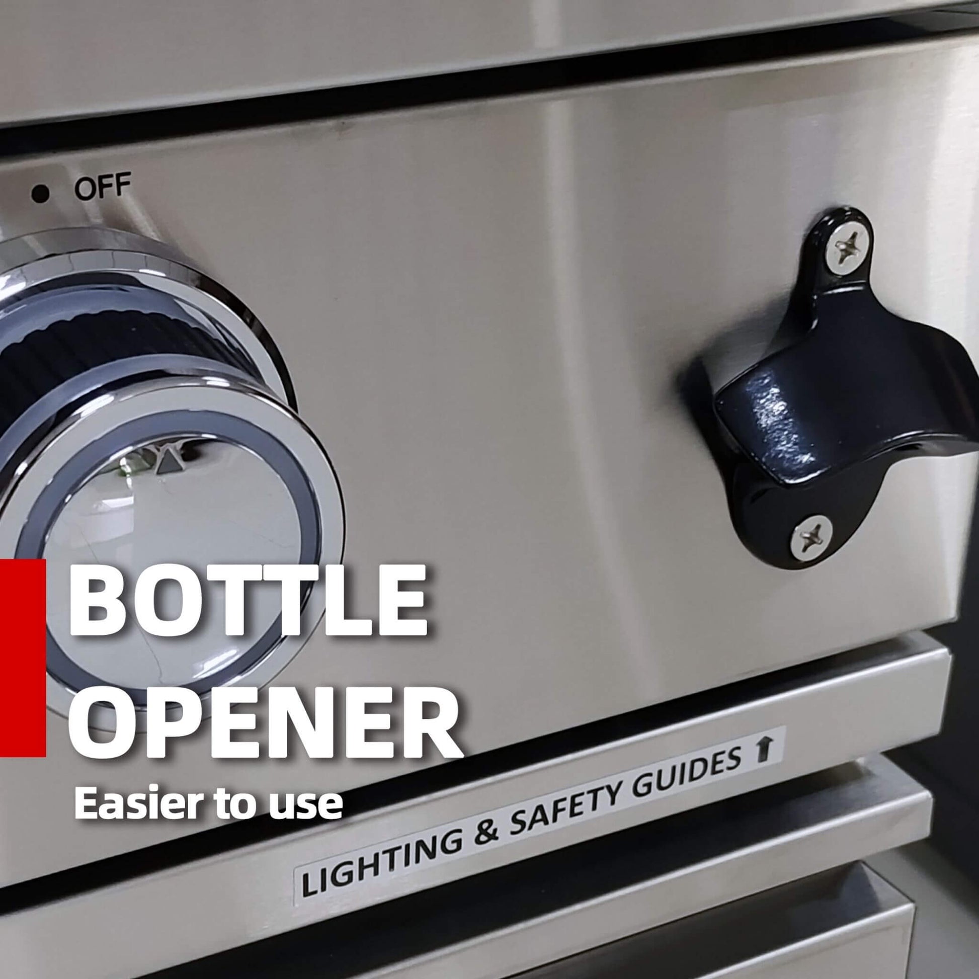 Beyond the generous cooking area, you get the convenience of a built-in outdoor-rated refrigerator with a stylish glass door for perfectly chilled drinks, ample storage cabinets and drawers, elegant granite countertops, and captivating on/off red/white changing control knob lights to set the mood.