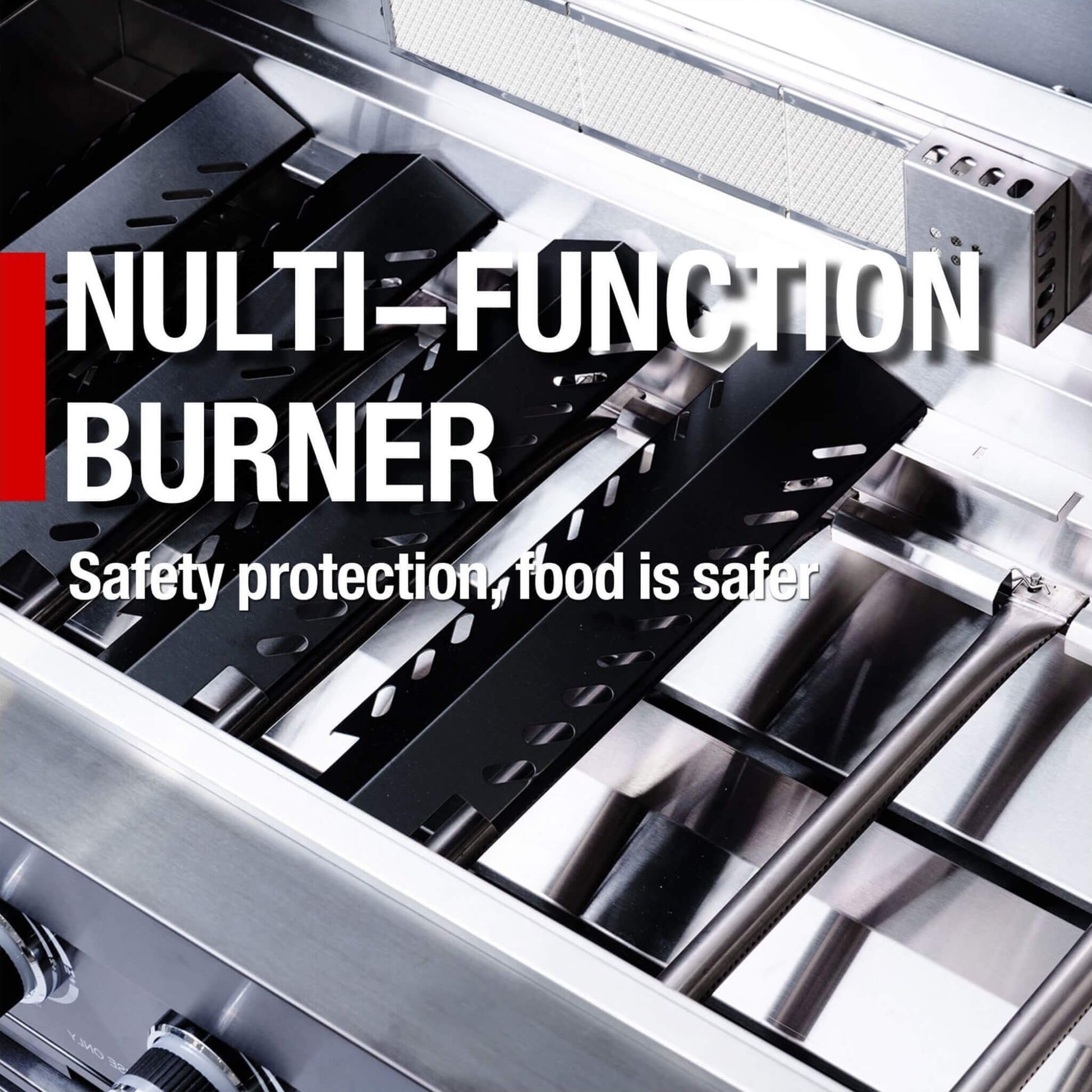 This luxurious 85,000 BTU powerhouse features six high-efficiency burners and a rear ceramic infrared burner for steakhouse-quality searing and rotisserie perfection, all set within a sleek, corrosive and rust-resistant 304 marine-grade stainless steel body that guarantees lasting beauty and easy cleaning.