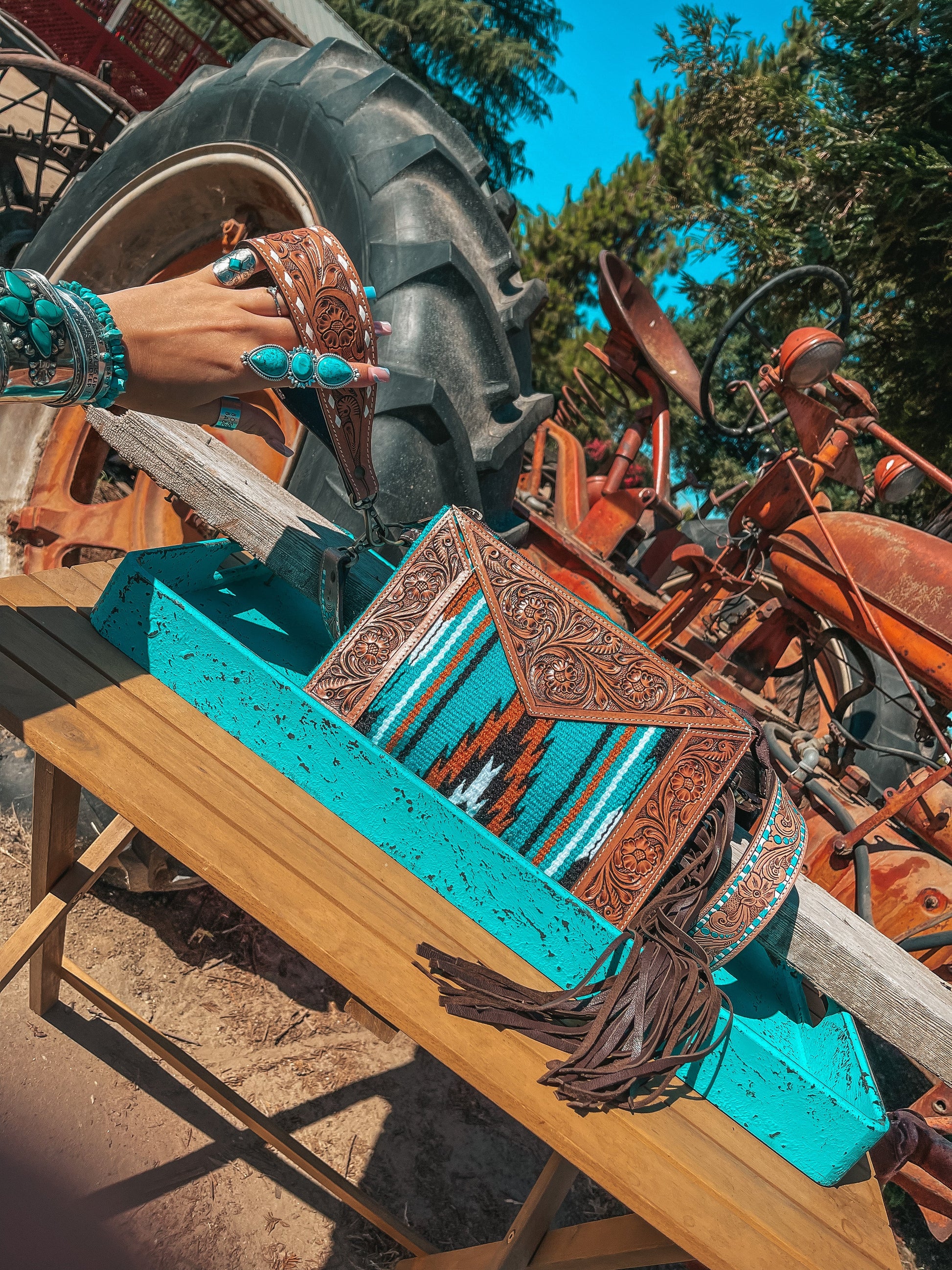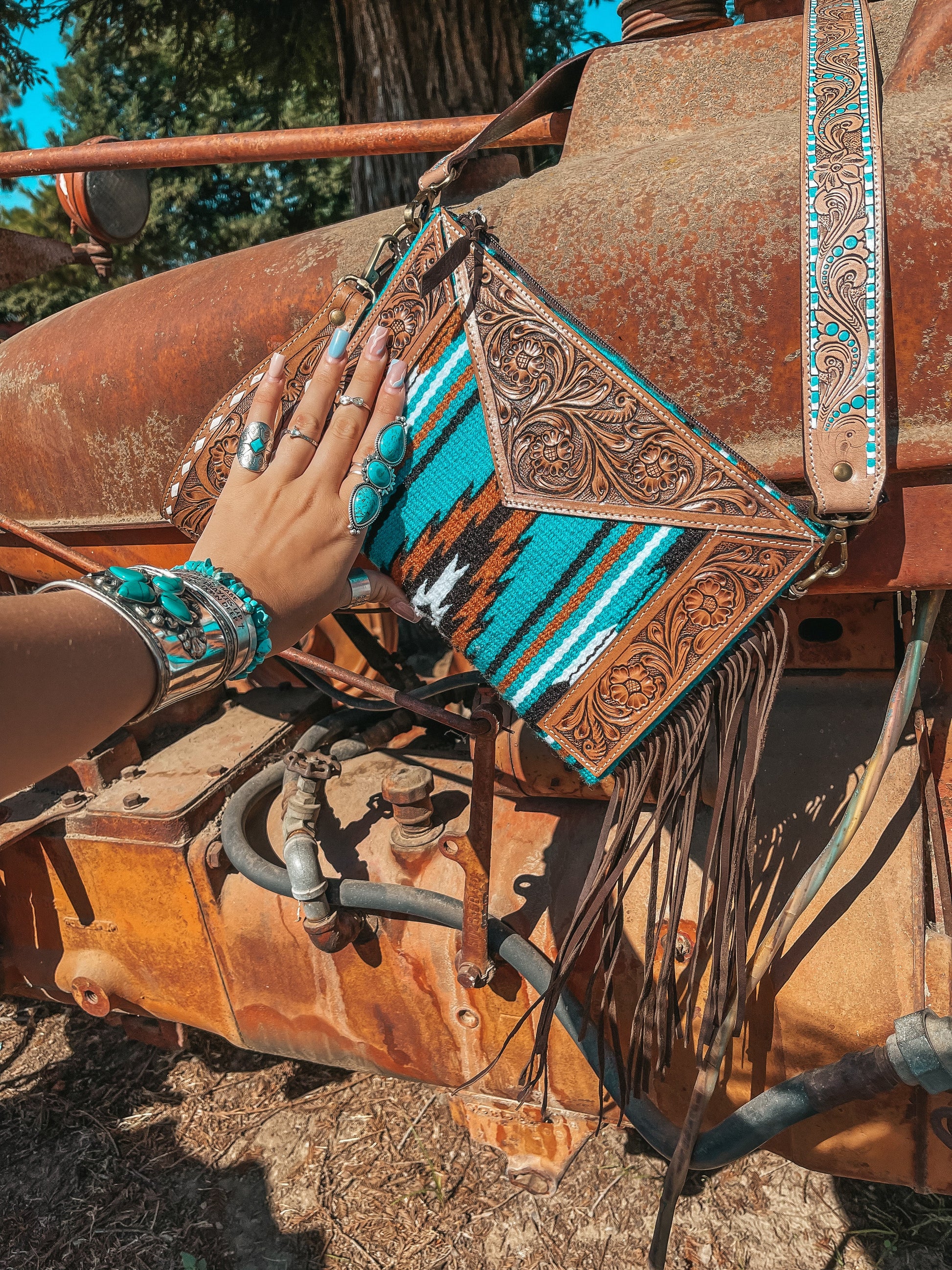 The dimensions are approximately 11.5' x 7.75". There is one zipper pocket inside, and the fringe is 12"