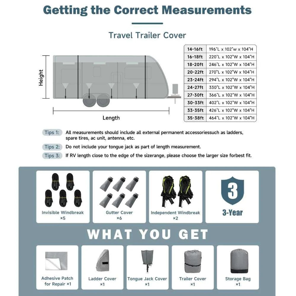 Package Includes: 1 travel trailer cover, 1 storage bag, 1 tongue jack cover, 1 ladder cover, 1 adhesive repair patch, 2 extra wind ropes, and 6 sponge-designed gutter covers that can also protect sharp RV parts